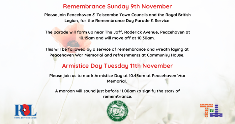 Please join Peacehaven & Telscombe Town Councils and the Royal British Legion, for the Remembrance Day Parade & Service