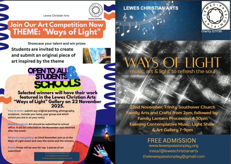 Lewes Christian Arts, the successor to the Lewes Passion Play, is holding an event called 'Ways of Light' on Saturday 22nd November at Southover Church: 'Music, art & light to refresh the soul'. In the afternoon there will be craft activities for families – lantern-making and singing for children, followed by a family lantern procession. The evening consists of specially-written music on the theme, with light show, poetry, drama, a guest band, and an art gallery to be viewed.