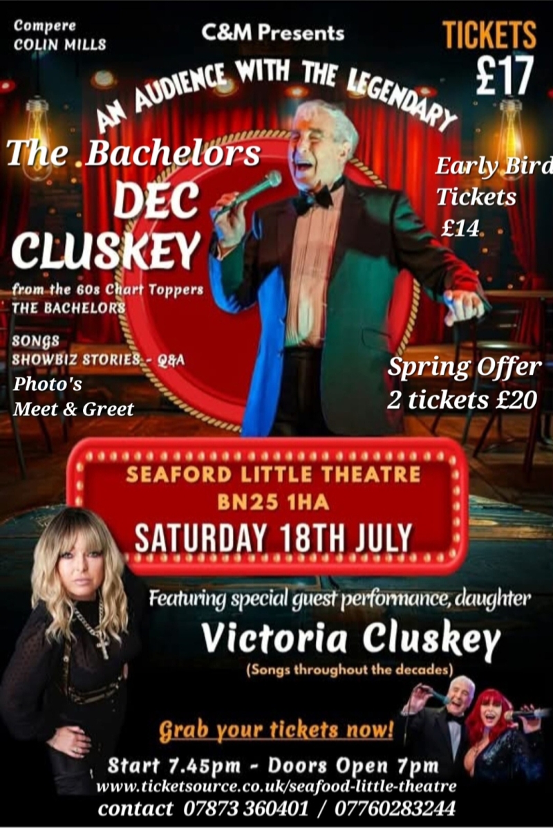 Dec Cluskey from 60s chart toppers The Bachelors has kindly agreed to this one off special evening. Dec will be singing all The Bachelors hits, I Believe, Charmaine, Ramona, Diane, telling Showbiz Stories from life on the road and a Q&A.