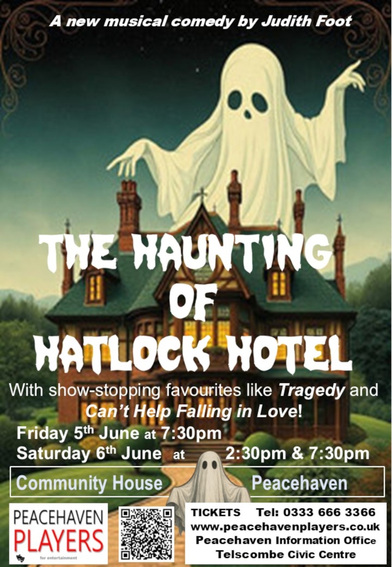 This June Peacehaven Players present “The Haunting of Hatlock Hotel”, a brand‑new jukebox musical by Judith Foot. With show-stopping favourites like Tragedy an Can't Help Falling In Love. Packed with eccentric characters, ghostly goings‑on and toe‑tapping tunes, the story follows the spirited Elizabeth Hatlock—quite literally—after she returns as a ghost to watch over her beloved family hotel.