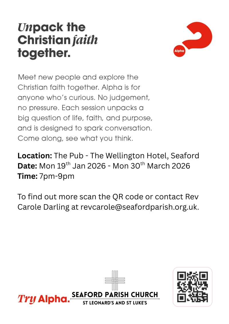 Seaford Parish (St Leonard's and St Luke's) is running Alpha at the Wellington Hotel in Seaford on Monday evenings starting on 19th January at 7pm. It is free! Everyone is welcome!