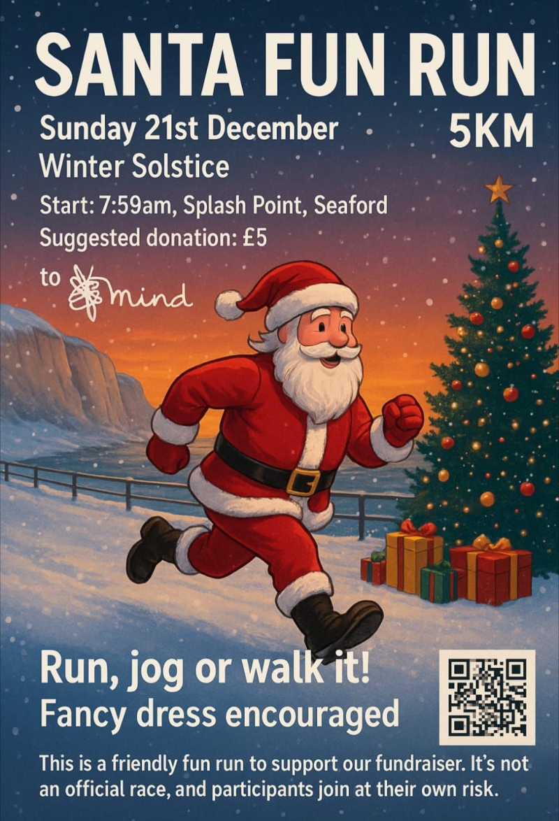 Come and join the Seaford Sunrise Crew for a bit of fun. Run, jog or walk. Dress up as Santa if you want to. Free Santa Hats, hot chocolate and cookies. All welcome. Adults. Children. Dogs on leads. Babies in running buggies. Xmas fun. Beating the winter blues. And raising money for MIND. Spread the word. The more, the merrier.