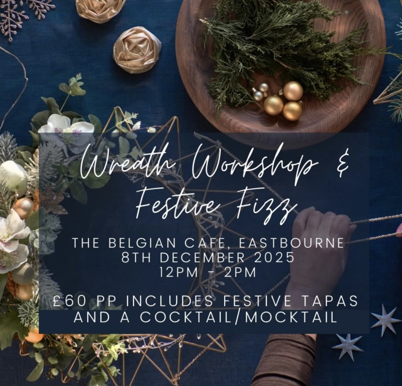 Join us at the Belgian cafe in Eastbourne and take part in this fabulous Christmas wreath workshop and enjoy festive tapas and cocktails/mocktails.