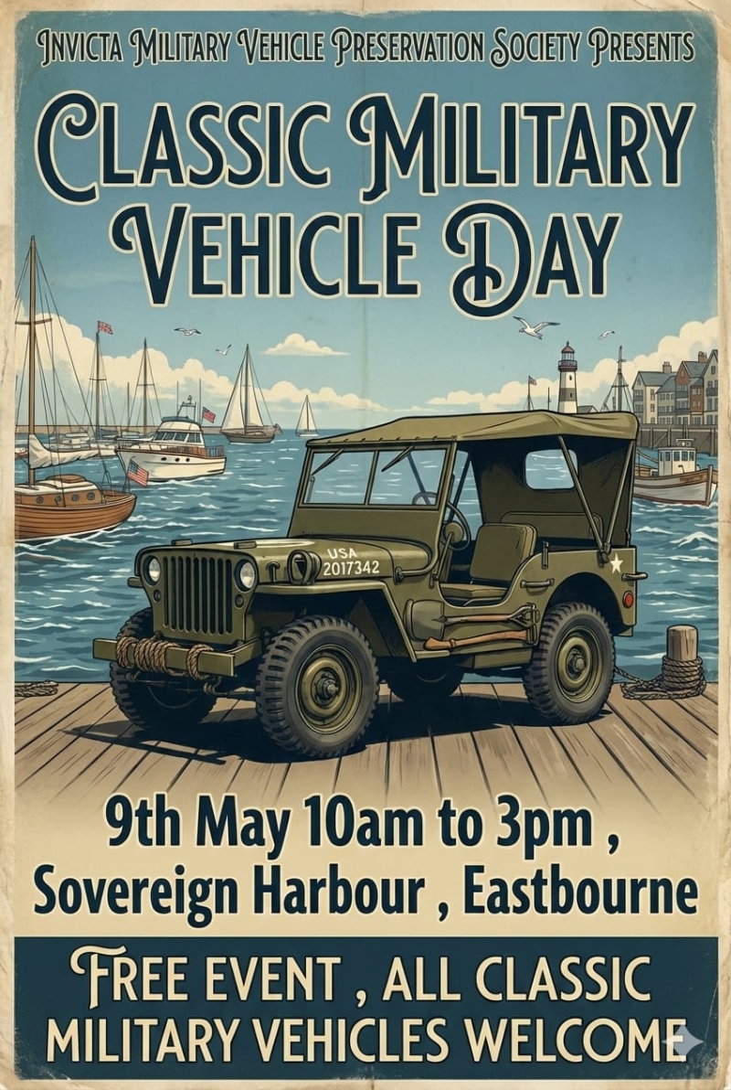 A collection of classic military vehicles sponsored by Invicta Military Preservation Society on display at Sovereign Harbour. Includes military style boot sale.